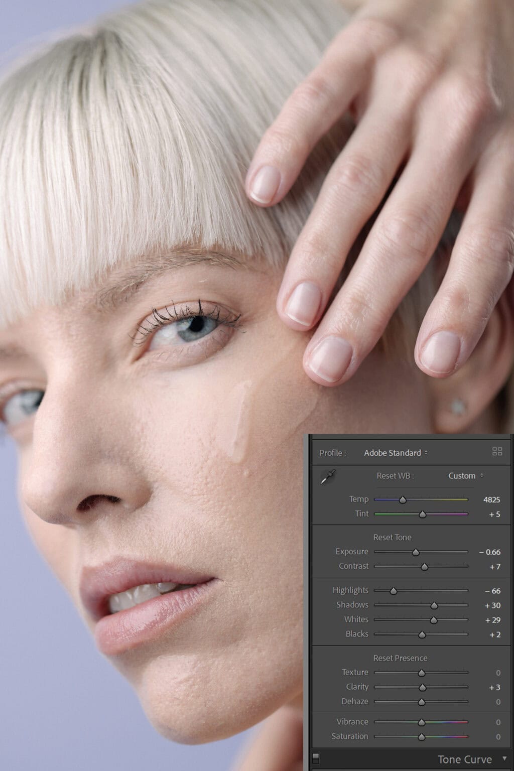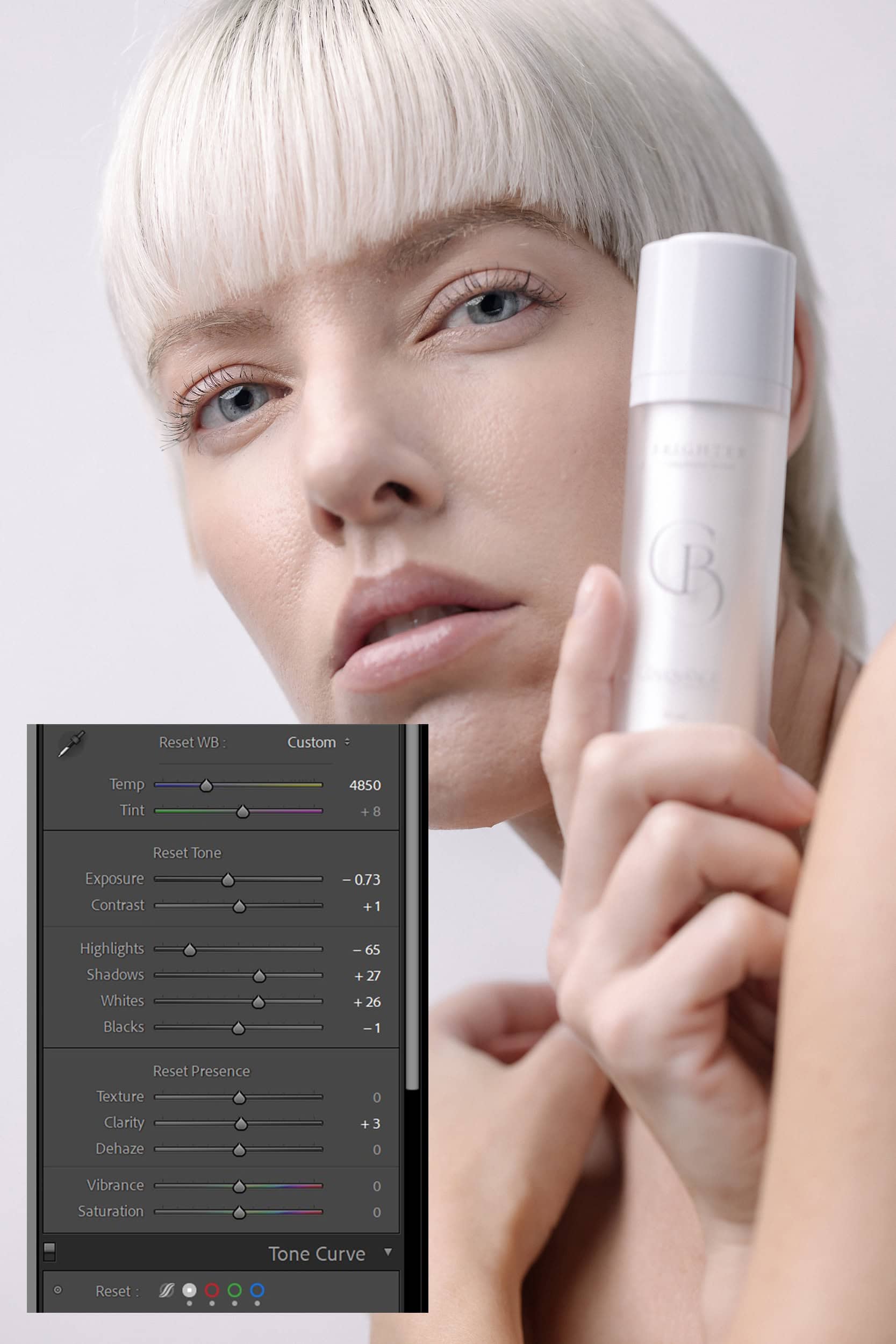 I ran one of my recent skincare campaigns through some of the Talent AI options to show you the outcome. I used the Modern Classic talent profile. You will see that although the images were all edited by the same profile, they each received adjustments unique to that image’s needs.
